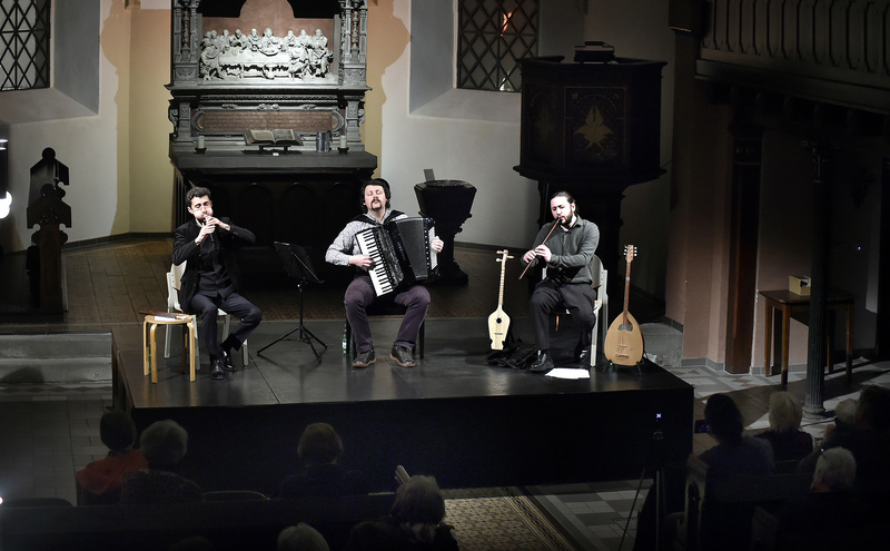 Eine ganz besondere Veranstaltungsreihe, der Klangkosmos Weltmusik in NRW, machte nun auch wieder in Gelsenkirchen Station. Das A.G.A Trio (Armenien/Georgien/Anatolien), allesamt Musiker mit armenischen Wurzeln, demonstrierte eindrucksvoll, wie nahe sich die Kulturen ihrer Länder im Laufe der Geschichte waren. Die drei Musiker Arsen Petrosyan (Duduk), Mikail Yakut (Akkordeon) und Deniz Mahir Kartal (Kaval/Gitarre) brachten dem zahlreichen Publikum an diesem Frühlingsabend die einzigartige Schönheit der uralten Melodien zu Gehör. Neben dem Stammpublikum kamen diesmal auch viele Landsleute der Musiker in die Bleckkirche. Kaval, Duduk und Akkordeon gehören zu den meist verbreiteten Instrumenten in ihren Ländern.