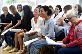 Das findet auch Julia. Die 33-jährige singt im Sopran, ist gemeinsam mit ihrer Mutter hier zum Workshop in die Alte Kirche Wattenscheid gekommen: „Ich hab schon Chorerfahrung und lerne schnell, aber das ist ganz egal. Ich finde, Katharinas Art, wie sie es uns beibringt, einfach toll.“ Von den vier Liedern, die hier im ganztägigen Workshop einstudiert werden, gefällt ihr besonders das letzte, „Herr, segne uns“. Strahlend fügt sie hinzu: „Das hab ich gleich zu meiner baldigen Hochzeit ausgewählt!“