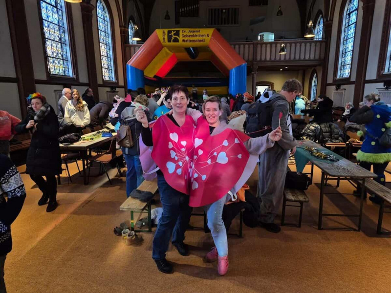 Passend zur Hüpfburg feierte die Gemeinde einen kurzen Karnevalsgottesdienst unter dem Motto „Mein Herz hüpft“ an Karnevalssonntag. Statt Kirchenbänken standen dafür Bierzeltgarnituren im Raum. Los ging es, etwas ungewöhnlich, um 10:10 Uhr. Grund dafür: Um 11:11 Uhr ging es vor die Kirche, denn dort startete der Kinder-Karnevalsumzug an der Hochstraße.