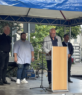 Mit Igor Kuznecov (Geschäftsführer der Jüdischen Gemeinde), Serdar Yilmaz (Sprecher Kreis Gelsenkirchener Muslime), Stadtdechant Markus Pottbäcker und Superintendent Heiner Montanus standen die Religionsgemeinschaften gemeinsam auf der Bühne. Frieden beginnt in unseren Herzen und findet sein Echo in unseren Taten“, sagte Superintendent Montanus. Nur durch konkrete Schritte im Alltag – von Nachbarschaftsprojekten über Bildungsangebote bis hin zum interreligiösen Dialog – könne Gelsenkirchen zeigen, dass Vielfalt eine Stärke sei. Igor Kuznecov formulierte es ähnlich: „Schalom bedeutet aktives Streben nach Gerechtigkeit, Sicherheit und Würde. Frieden beginnt bei uns selbst – und braucht Taten.“