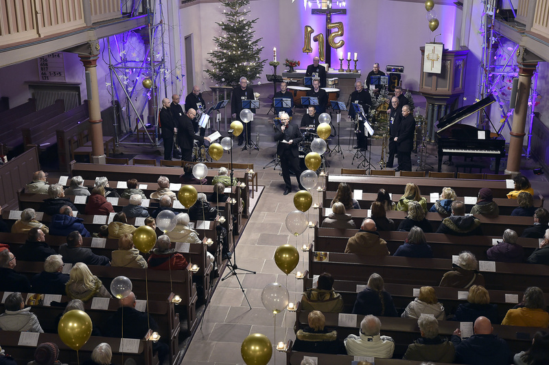 „Falsches Datum, falsche Uhrzeit, falscher Ort“, mit diesen Worten umschrieb Andreas Fröhling, der die Konzertreihe 2003 ins Leben rief, die besonderen Umstände dieses Emporenkonzerts in der Ückendorfer Kirche. Denn normalerweise versammeln sich Musizierende und Zuhörerinnen und Zuhörer immer wieder am 15. eines Monats auf der Orgelempore. „Und immer um 19.00 Uhr, das steht fest in meinem Kalender“, bekräftigt eine Besucherin. Nun, diesmal begann das Konzert schon zwei Stunden früher. Fleißige Mithelfende hatten die Nicolai-Kirche festlich mit Luftballons geschmückt. Im Altarraum erstrahlte eine güldene 175.
