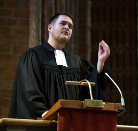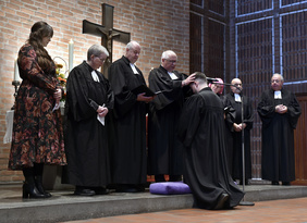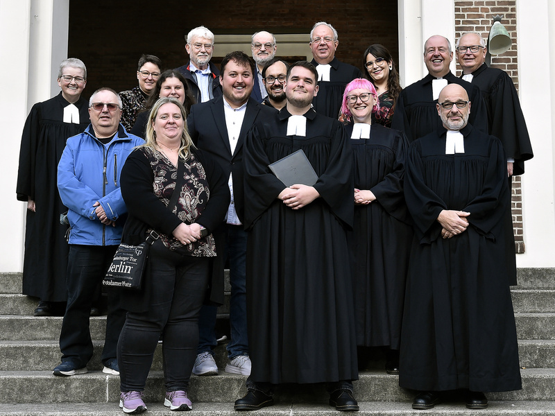 Superintendent Heiner Montanus betonte in seiner Ordinationsansprache, dass Werthschulte zu jenen gehöre, die den Mut hätten, neue Wege zu gehen: „Raus aus den Kirchmauern und mitten in die Öffentlichkeit, wo er nicht weiß, was als nächstes passiert.“ Als Beispiel nannte Montanus das Projekt „Nimm Platz“, bei dem der junge Pfarrer mit einer einfachen Bierzeltgarnitur auf dem Heinrich-König-Platz in Gelsenkirchen sitzt und Passant*innen zum Gespräch einlädt. „Da, wo Menschen unterwegs sind, ist Kirche präsent – ganz niederschwellig, ganz nah“, so Montanus.