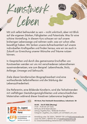 Der Kurs – Kunstwerk Leben – beginnt am Montag, 4. Mai um 17.00 Uhr im Paul-Gerhardt-Gemeindehaus, Industriestraße 38, umfasst neun Termine und kostet 74,00 Euro inkl. Material.
