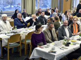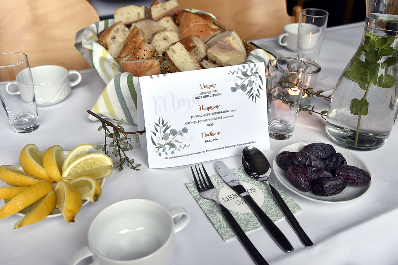 Pünktlich zum Sonnenuntergang um 18:33 Uhr erlebten alle Gäste das muslimische Fastenbrechen, es war „Iftar-Time“. Für das Essen sorgte ein engagiertes Team der Tuǧra-Moschee, das mit zahlreichen Speisen zu einem gelungenen Abend beitrug. Serdar Yilmaz von der IGMG-Moschee in Hassel und Hüseyin Kar von der Ditib-Zentralmoschee halfen mit Übersetzung und Erklärung der arabischen Texte und Gebete, Stanislav Krasnokutskiy stellte noch ein jüdisches Tischgebet vor. Die Veranstaltung bot viel Raum für Austausch und machte deutlich, dass Begegnung und Dialog zentrale Bausteine für ein friedliches Miteinander in der Stadt sind. Die Veranstaltung ist zugleich ein Beitrag zu den Internationalen Wochen gegen Rassismus, die am 16. März offiziell beginnen und viele weitere Gelegenheiten zum Austausch und Dialog bieten werden.