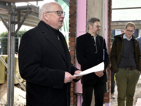 „Wir hatten hier schon einen heftigen Baudruck“, stellt Investor Nils Wolter bei der Zusammenkunft zur feierlichen Grundsteinlegung auf der Baustelle fest. „Ende 2022 wurden die Gespräche über einen Neubau erst einmal eingestellt. Mitte 2023 haben wir uns wieder zusammengerauft und kamen auf die Idee, „Haunerfeld“ hier noch einmal zu bauen.“