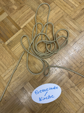 In mehreren Arbeitseinheiten betrachteten die Teilnehmenden ihre persönlichen Sichtweisen aus drei Blickwinkeln: Ich und mein Glaube, Ich und Kirche bzw. Gemeinde sowie Mein Glaube und Kirche/Gemeinde. Mit Hilfe eines „Dreiecksseils“ wurde sichtbar, wo jede und jeder Einzelne mit den eigenen Themen steht. Die Methode führte zu intensiven Gesprächen über persönliche Überzeugungen, Verantwortung und die Rolle der Kirche in der heutigen Zeit. Im Laufe der gemeinsamen Arbeit entwickelte sich dabei das Bild des „gordischen Knotens“ – als Sinnbild für die komplexen Verbindungen zwischen Glaube, Person und Kirche.